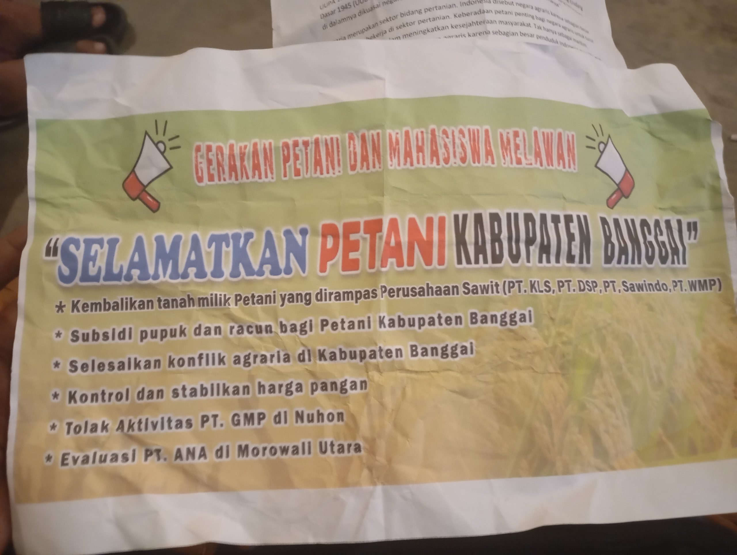 Adapun Isi selebaran yang mereka bagikan adalah : Selamatkan Petani Kabupaten Banggai