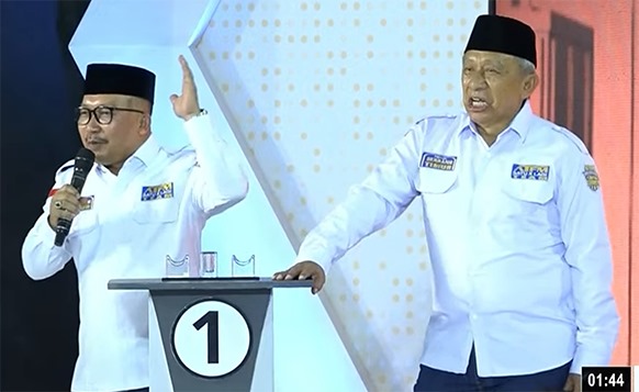 Penekanan paslon Amirudin Tamoreka dan Furqanuddin Masulili atau disingkat AT-FM menjawab pertanyaan terkait pengelolaan lingkungan berwawasan lingkungan di debat publik putaran kedua yang berlangsung di Hotel Estrella, Luwuk, Minggu (10/11/2024).