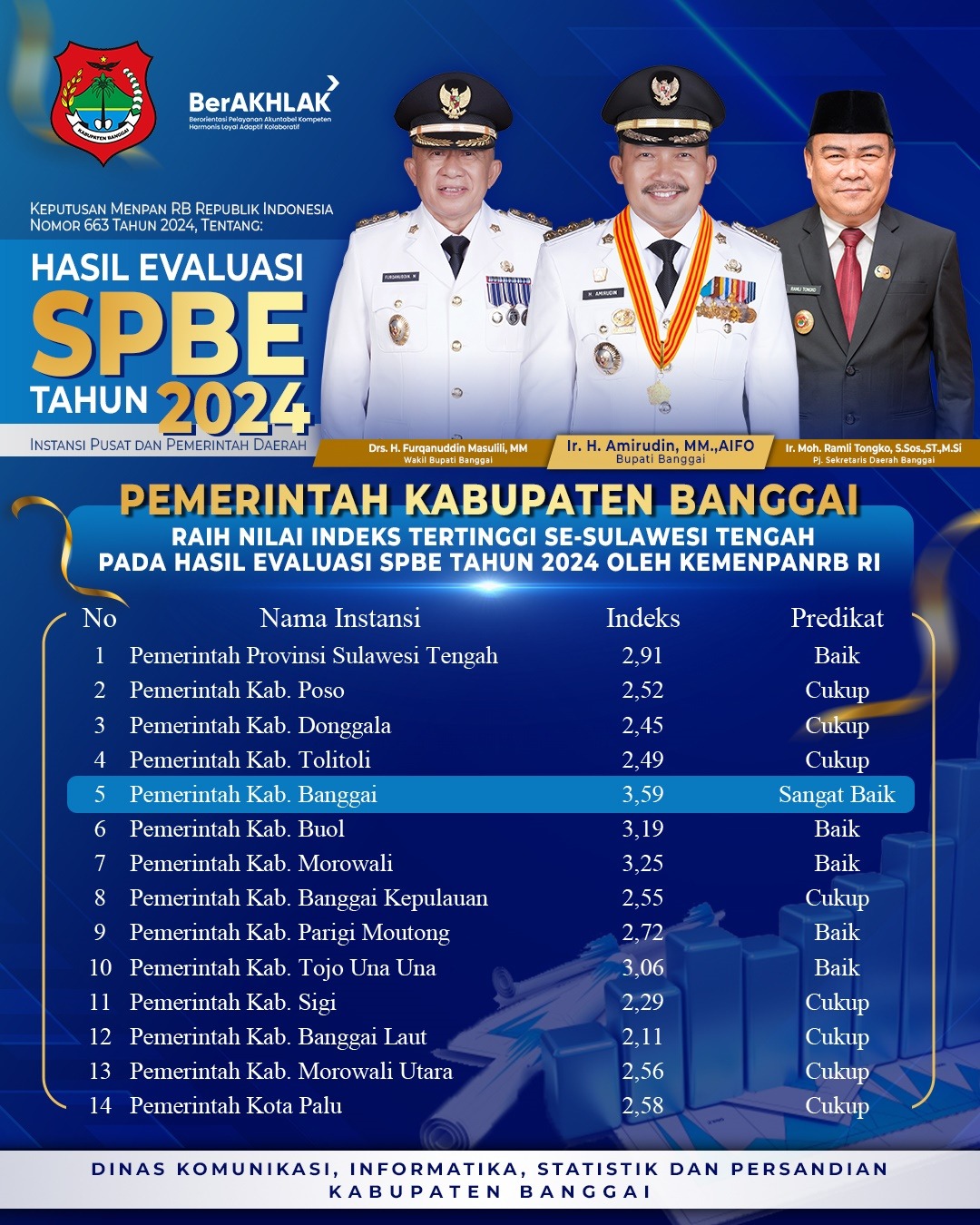 Dengan capaian ini, Kabupaten Banggai diharapkan dapat terus menjadi teladan dalam penerapan sistem pemerintahan berbasis elektronik, tidak hanya di Sulawesi Tengah, tetapi juga di tingkat nasional.