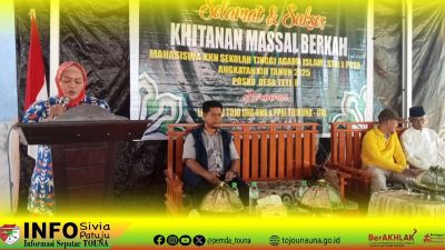 ININFO.ID, AmpanaTete -Bupati Touna diwakili Staf Ahli Bidang Pemerintahan Hukum dan Politik Setdakab Tojo Una-Una Viyayantisyah Latjuba, hadir dalam kegiatan Mahasiswa KKN Sekolah Tinggi Agama Islam (STAI) Poso bekerjasama dengan Lazismu dan Persatuan Perawat Nasional Indonesia (PPNI) Kabupaten Tojo Una-Una dalam rangka Khitanan Massal di Aula kantor Desa Tete B, Kecamatan Ampana Tete, Minggu (06/07/2025).